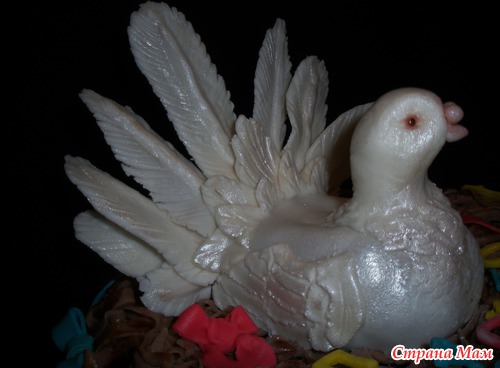 Шококипяток, заварной шококрем, бананы, полуганаш под мастику, мастика молочная и офигительная, в теле голубки картошка кондитерская. В знак благодарности персоналу Д/С "Голубок". Муж мой сказал, что - енто курица...
