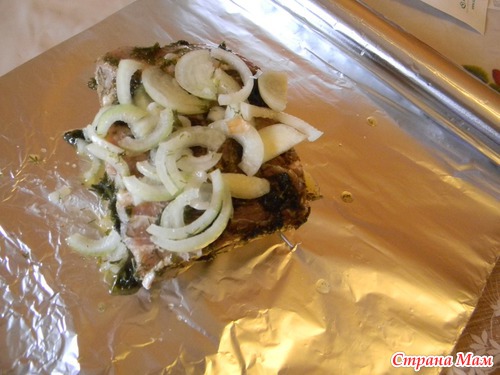 Выкладываем замаринованное мясо на фольгу. Добавляем нарезанный полукольцами лук.