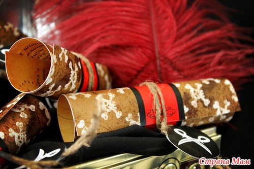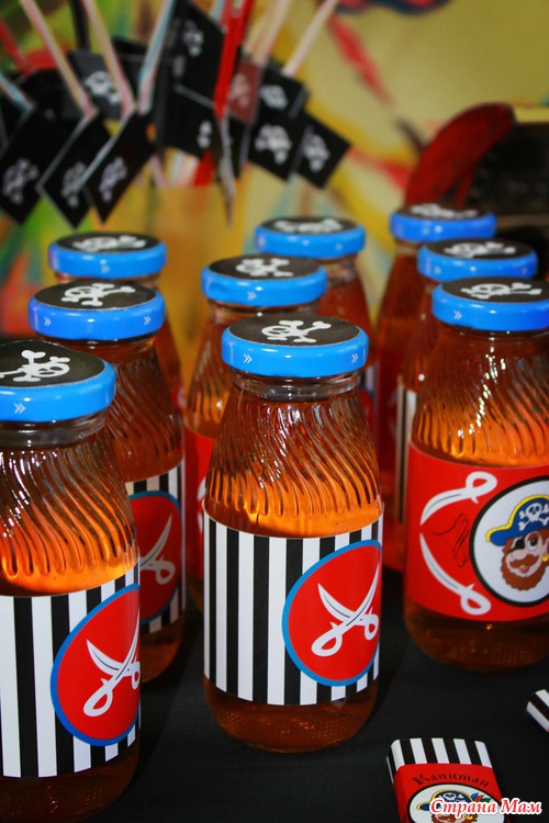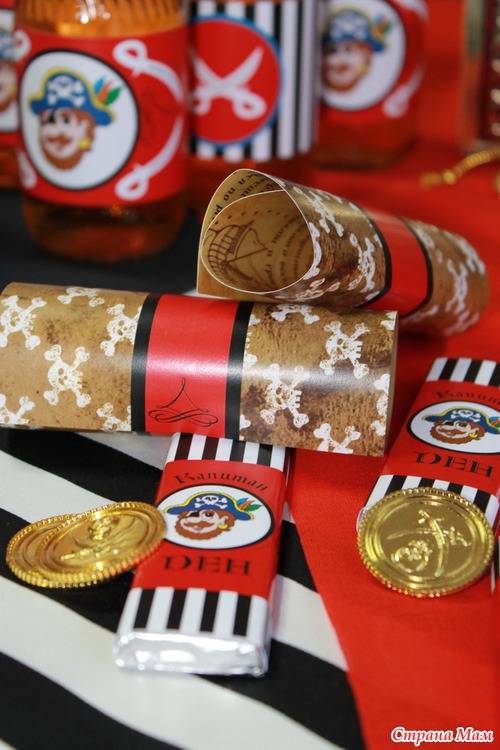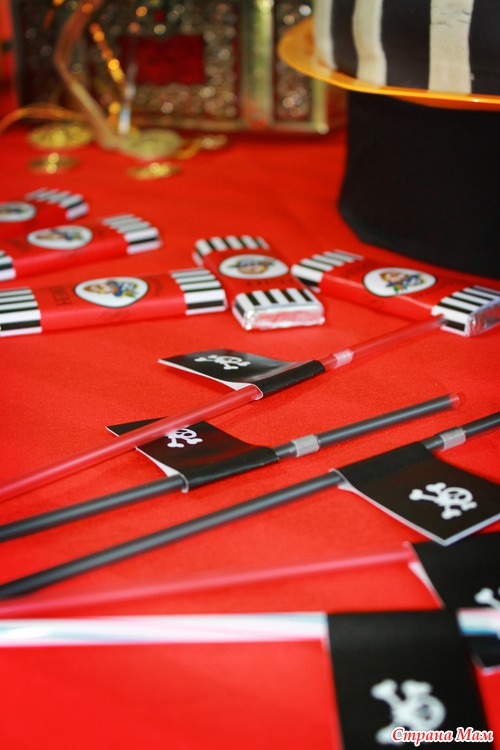 Трубочки с пиратским флагом, на заднем плане шоколадки для гостей