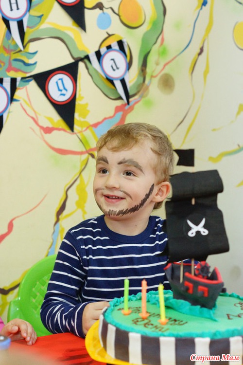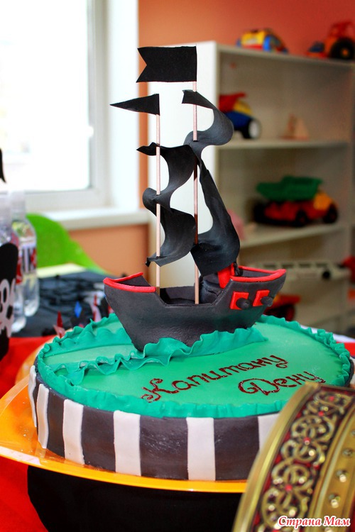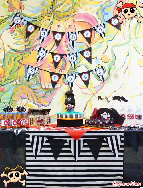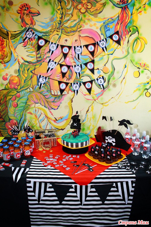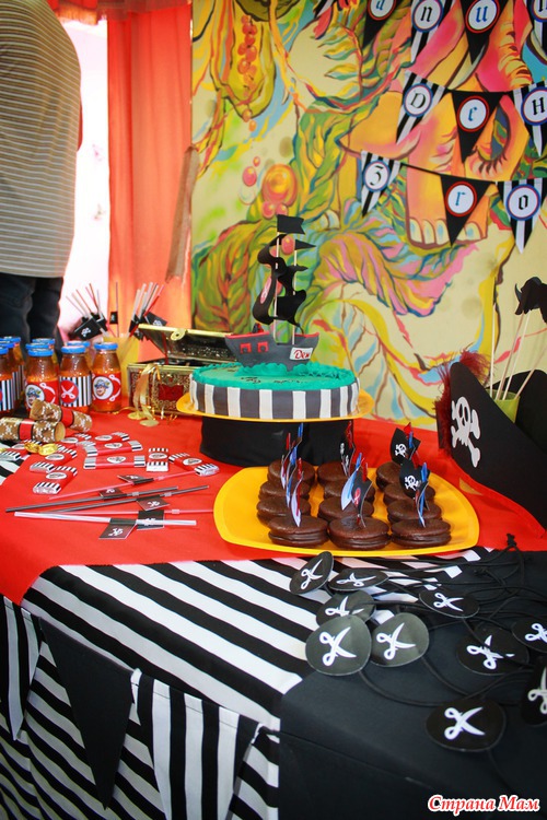 Привет всем читающим!В прошлую субботу оформляла день рождения прикольному мальчугану - Дениске! Побеседовав с мамочкой, остановились на теме пиратов. Мероприятие проходило в детской игровой комнате. Решено было оформить сладкий стол, изготовить кое-какую атрибутику и попросили испечь торт "по теме".