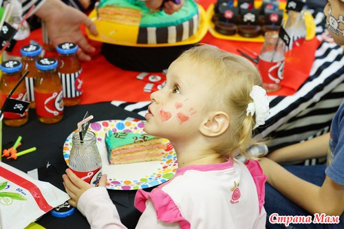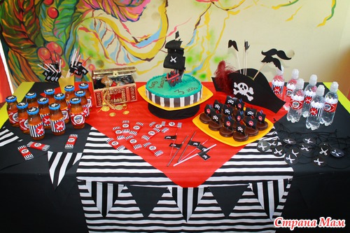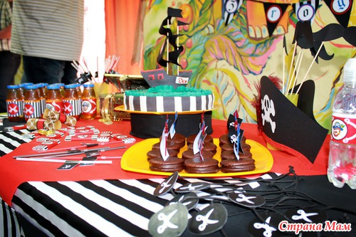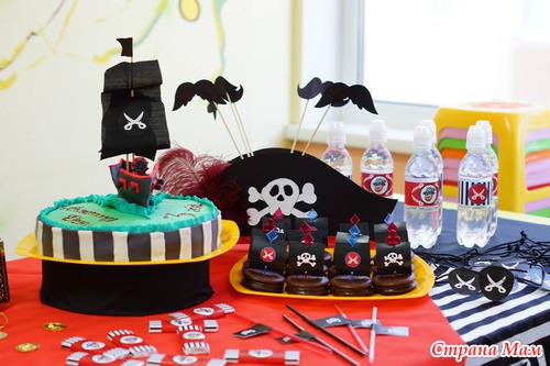В прошлую субботу оформляла день рождения прикольному мальчугану - Дениске! Побеседовав с мамочкой, остановились на теме пиратов. Мероприятие проходило в детской игровой комнате. Решено было оформить сладкий стол, изготовить кое-какую атрибутику и попросили испечь торт "по теме".