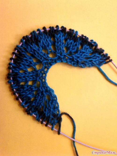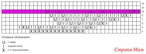 3. в каждом следующем лицевом ряду между накидом и двумя вместе петлями прибавляется по 2 провязаные петли