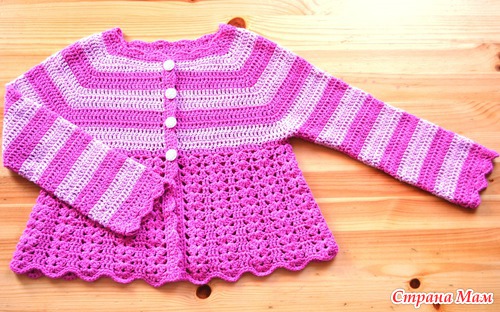 Нитка мягкая, приятная на ощупь, в виде шнурочка косичками, немного цепляет и легко затягивается. Я вязала из неё крючком нр 3 детский кардиган на рост 104-110см. Получилось мягкое, но тяжёлое полотно. После стирки немного растянулось. Вот моя кофточка: