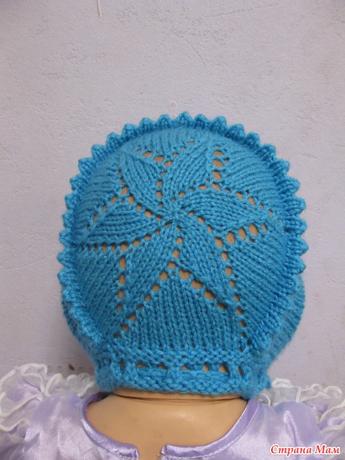 еще я вязала из меланжевой ниточки с рюшками спереди и на затылочке. очень красиов получается, но фото к сожалению нет