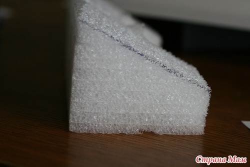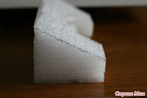Теперь берем пористый материал.( у меня какая то штука, которой обкладывают бытовую технику в коробках) и вырезаем из нее параллелепипед со скосом