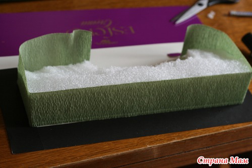Обклеиваем торец зеленой гофробумагой, излишки обрезаем
