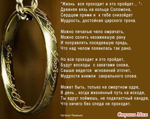 Прошло много лет... Царь Соломон стал известен как мудрый правитель. Он женился и жил счастливо. Жена стала самым чутким и близким его помощником и советчиком. И вдруг она умерла. Горе и тоска охватили царя. Не веселили его ни танцовщицы и певуньи, ни состязания борцов... Печаль и одиночество. Приближающаяся старость. Как с этим жить? Он взял кольцо: "Все проходит"? Тоска сдавила его сердце. Царь не хотел мириться с этими словами: с досады бросил кольцо, оно покатилось - и на внутренней поверхности что-то мелькнуло. Царь поднял кольцо, подержал в руках. Почему-то раньше он не видел такой надписи: "ПРОЙДЕТ И ЭТО".