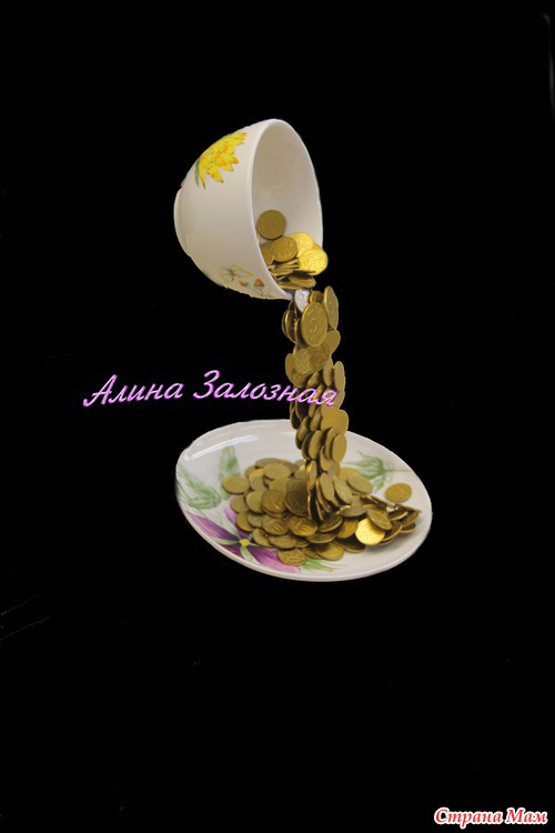Спасибо большое!!! Но я и не то и не другое)))) и идея не моя а тут насмотревшись на мастериц решила тоже попробовать))) Делала без МК сама по памяти что об этом читала когда то... между блюдцем и чашкой вилка согнутая))) благо на работе есть слесаря ребята вот их и попросила))) а дальше просто покрасила монеты золотой краской и приклеивала так чтобы вилку спрятать.