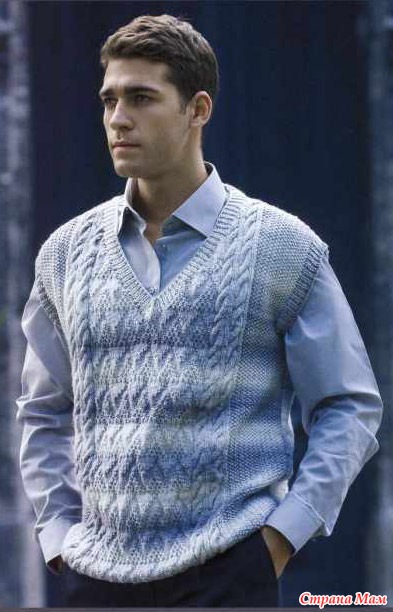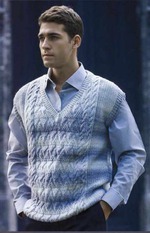 СПИНКА: Начать вязание, как перед. После резинки продолжить в проймы для рук, как указано в описании переда. На высоте 25 см. от пройм закрыть все петли. Выполнить один из плечевых швов. Набрать на спицу петли вдоль края горловины и провязать резинкой 1×1, попеременно провязывая 1 лицевую и 1 изнаночную петлю. В самом углу V-образного выреза в каждом обратном ряду провязать 3 петли вместе. Провязать 8 рядов и закрыть все петли. Выполнить второй плечевой шов. Набрать на спицу петли вдоль пройм для рук и провязать 8 рядов резинкой. Выполнить боковые швы. Связанное изделие рекомендуется обдать паром, не прикасаясь утюгом к изделию.