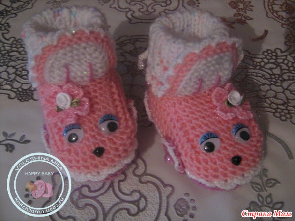Если хотите сделать более тёплый вариант, сделайте имитацию носочков, связанный резинкой 1*1 отворотик. Для этого, до сшивания пинеток, по изнаночной стороне пинетки набрать чуть ниже края, по перемычкам петелек 33 петли и вязать резинкой 1*1, 12-15 см. А затем уже сшить пинетки. Удачи!!!