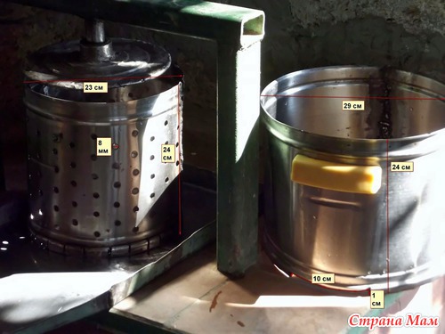 Ну а это сами "кастрюли", в которых и давится виноград. И внутренняя кастрюля (которая с отверстиями), и наружная - сделаны из нержавеющего бака от стиральной машинки. Кастрюли без дна. Они вставляются друг в друга. Отверстия в кастрюле муж сверлил сам. Отверстия расположены в шахматном порядке. В наружной кастрюле внизу вырезан небольшой зазор для свободного слива сока.