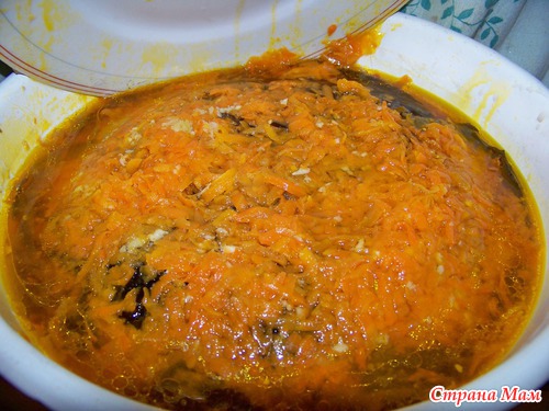 Слоями выкладываем в лоток, переслаивая поджаренной морковкой с чесноком, можно полосочки красного сладкого перца и немного горького молотого.