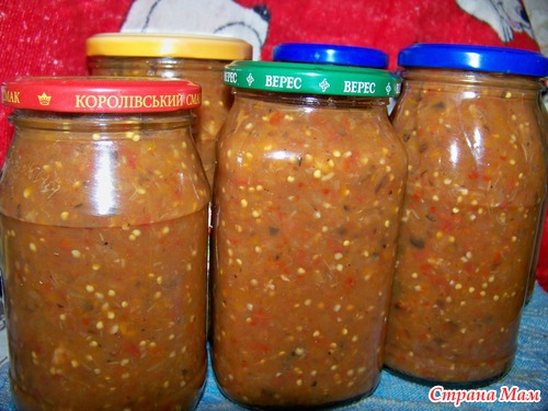 примерно 3 кг баклажан осталось вареных, перекрутила на мясорубку, добавила примерно 1-1,5 кг помидор и перца, тоже через мясорубку, поставила тушиться, наверное около часа