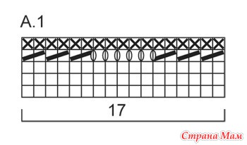 Набрать 170-187-204 п. и связать 1 рубчик платочной вязкой. Далее вязать согласно диаграмме А.1. Связав А.1 по вертикали на 12-13-14 см., связать 1 рубчик платочной вязкой, при этом в первом ряду рубчика убавить равномерно 17 п. = 153-170-187 п. Далее вязать жемчужным узором 12-13-14 см. вверх, затем связать 1 рубчик платочной вязкой, при этом в первом ряду рубчика убавить равномерно 17 п. = 136-153-170 п. Вязать по диаграмме А.1 12-13-14 см. по вертикали, связать 1 рубчик платочной вязкой, при этом в первом ряду рубчика убавить равномерно 17 п. = 119-136-153 п. Далее вязать жемчужным узором 12-13-14 см. вверх, затем связать 1 рубчик платочной вязкой, при этом в первом ряду рубчика убавить равномерно 17-22-27 п. = 102-114-126 п. Высота изделия составляет 53-57-61 см. Далее вязать резинкой 2 Л. / 4 И. После 6 см. такой резинки связать первые 2 И. вместе в каждой И.-секции = 85-95-105 п. Продолжить вязать резинкой 2 Л. / 3 И. Когда высота резинки составит 12-13-14 см., связать последние 2 И. вместе в каждой И.-секции = 68-76-84 п. Продолжить вязать резинкой 2 Л. / 2 И. до высоты резинки 32-35-38 см. Закрыть все петли, провязывая лицевые петли лицевыми, а изнаночные изнаночными.