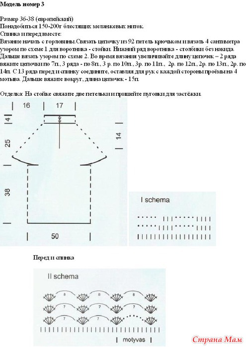 Вязание спинки и переда (вяжутся вместе): вязание крючком начать с горловины. Связать цепочку из 92 петель крючком и далее вязать 4 сантиметра узором по схеме 1 для воротника - стойки. Нижний ряд воротника обвязать столбиками без накида. Далее вязать узором по схеме 2. Во время вязания увеличивайте длину цепочек - 2 ряда вяжите цепочки по 7 п., 3 ряда по 8 п.,3 ряда по 10 п., 3 ряда по 11 п., 2ряда по 12 п., 2 ряда по 13п., 2 ряда по 14 п. С 13 ряда перед и спинку соедините, оставляя для рук с каждой стороны проемы на 4 мотива. Далее вязать по кругу, длина цепочек - 15 п.