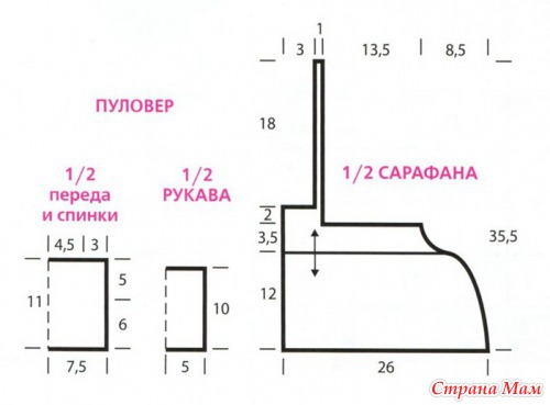 Пуловер. Для переда на спицы № 3.5 меланжевой нитью наберите 35 п., свяжите 11 см лиц. гладью и петли закройте лиц. Спинку свяжите так же. Для каждого рукава на спицы № 3.5меланжевой нитью наберите 24 п., свяжите 10 см лиц. гладью и петли закройте. Выполните плечевые швы; втачайте рукава, выполните боковые швы и швы рукавов.