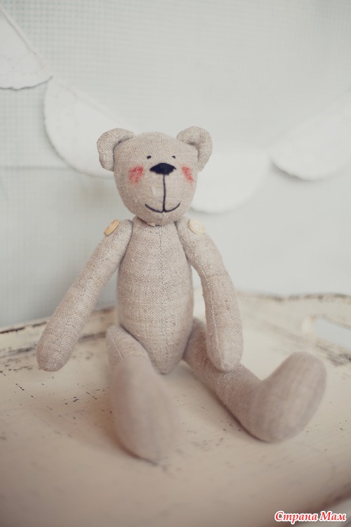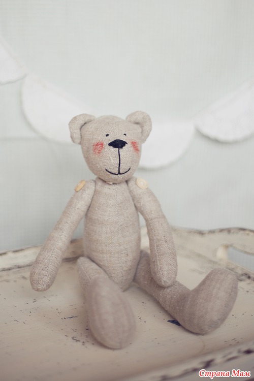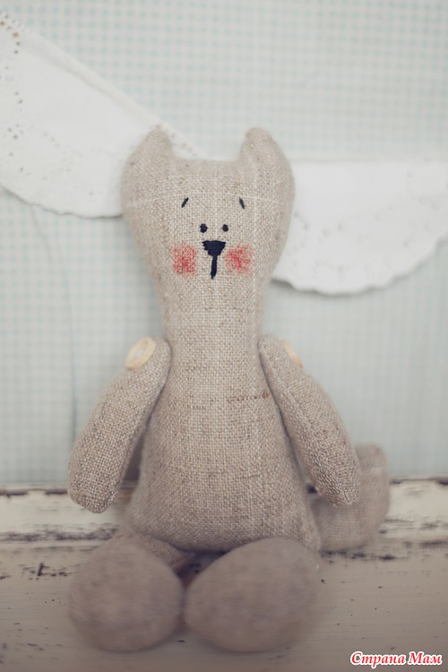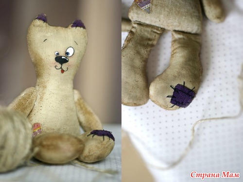 Решила опробовать выкройку на льне, и задние лапки вшила, для верности, чтоб маленькие ручки их быстренько не оборвали, правда сидит кот неважнецки, только с опорой...