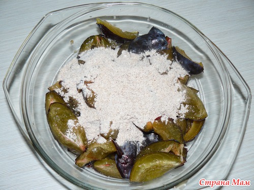 Сливы порезать на 4-5 частей. Я готовила начинку в 2 этапа, для каждого пирога отдельно. В мисочке смешать сахар с крахмалом (по одной столовой ложке), в первую кростату я добавила еще пол чайной ложки корицы. Всыпать все это к сливам и перемешать.