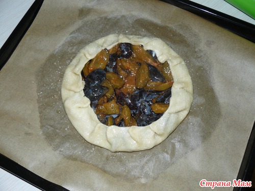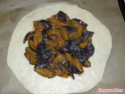 Половину теста раскатать в круг толщиной примерно 3 мм., в центр выложить начинку, оставляя по краям по 5 см.