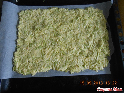 Готовила сегодня кабачковый рулетик, рецепт взят из сети, автор Светлана Голубева. Ингредиенты: Кабачок-1 небольшой( у меня 3 маленьких) Яйцо-1 шт. Мука-2 ст. л. Манка-2 стол. Соль. перец. Кабачок натереть+всё остальное. Приготовление: Противень застелить фольгой(у меня пергамент), хорошо смазать раст. маслом, вылить получ. массу. Я выкладывала толщиной в 1 см., но лучше делать корж толще, 1,5 см. т. к он оседает. У меня получился большой корж, я его тонко размазала, пришлось потом его сворачивать вместе с мужем.