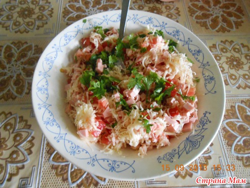 корж ставим в разогретую духовку запекаем при 250-15 минут( у меня на духовке цифры, ставила на 7, выпекала 30мин. чтобы низ подрумянился). Затем остужаем. Начинка: ветчина-100 г( у меня варёная колбаса) сыр-100 г помидор-1 шт. зелень, чеснок-2 зубч. всё мелко режем, сыр на мелкой тёрке. Начинку делала "на глаз", вот такой тарелки достаточно.