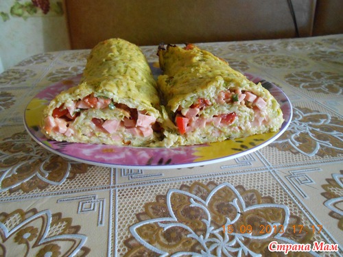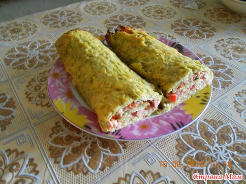Приготовление: Начинку укладываем на кабачков. лепёшку, сворачиваем рулетиком и запекаем при 250-15 минут. Вынемаем из духовке, перед тем как разрезать, рулет остудить. Получился вкусный рулетик, разрезала его на 2 части, т. к длинный получился.