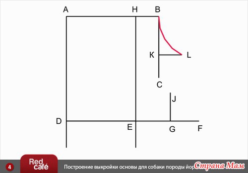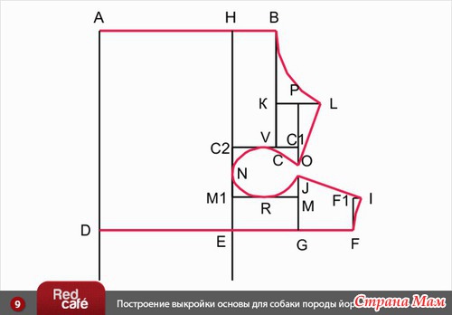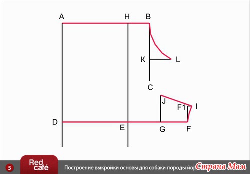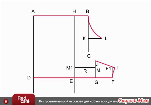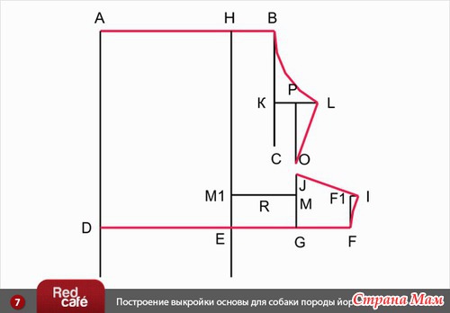 4). От • D вправо откладываем мерку Длина от ошейника до талии по животу, ставим • F.