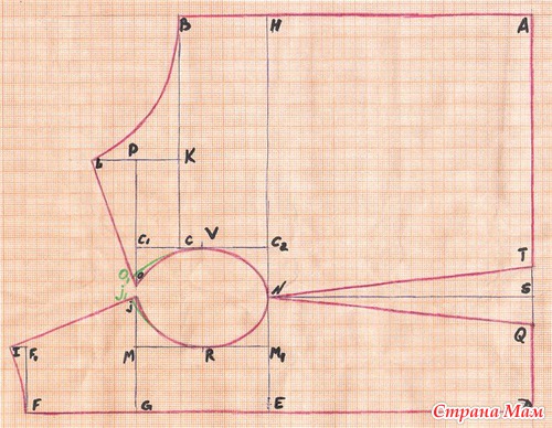 - Обводим выкройку по точкам последовательно двигаясь от одной к другой: А-B-L-O-V-N-R-J-I-F-D-Q-N-T-A