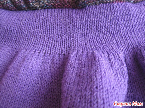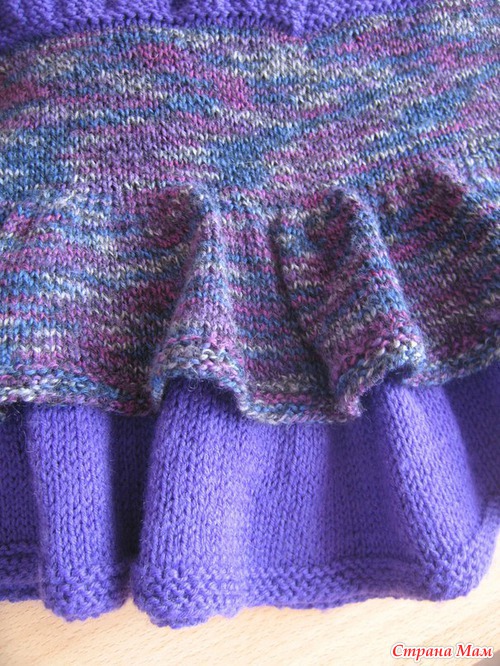У меня нитки были 2-х цветов: фиолетовые и пестрые с одним оттенком, поэтому я связала верхний и нижний воланы фиолетовым, а средний волан и основную кокетку с поясом (верх изделия) пестрыми.