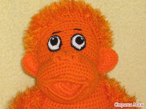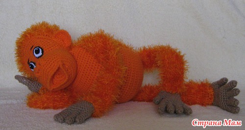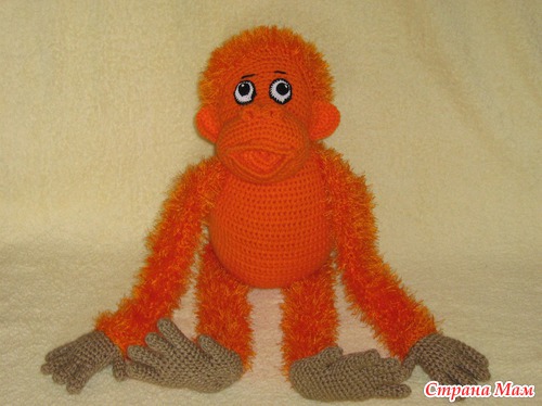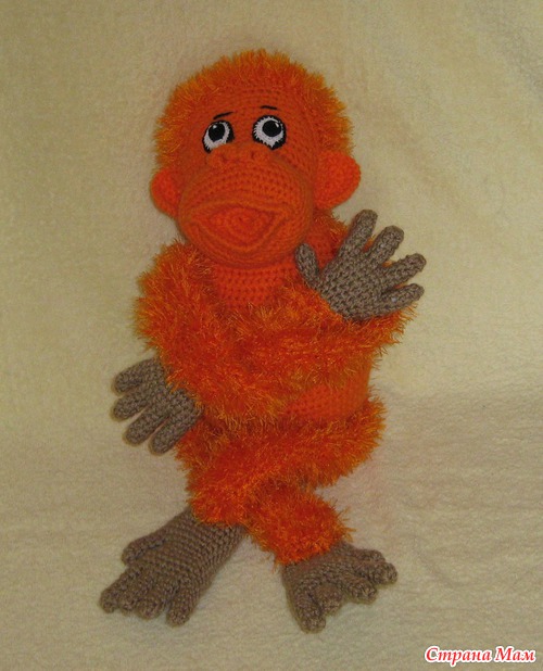 Если кого-то заинтересовало это обаятельное существо, то его вяжут в он-лайне здесь http://orangeknitting.ru/index.php?/topic/448-veselii-orangutang/. Требуется регистрация и 5 сообщений.