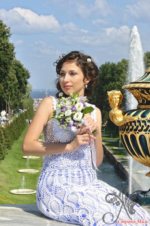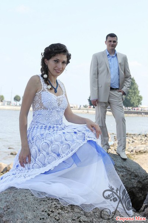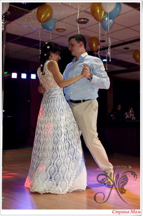 Ну вот, я их наконец то дождалась и спешу поделиться с вамиАвторов у этого платья, как вы понимаете два. Я вязала, а сама невеста отличный мастер по шитью, так что всю швейную часть она исполняла сама