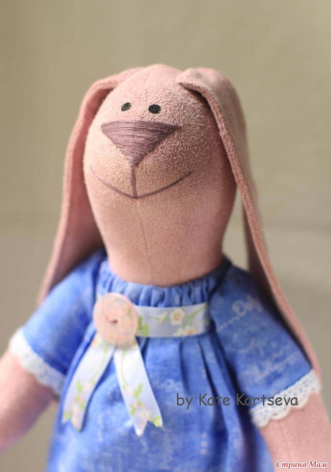 Эту зайку хочется трогать снова и снова. Она сшита из очень приятного материала - искусственной замши.