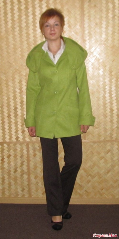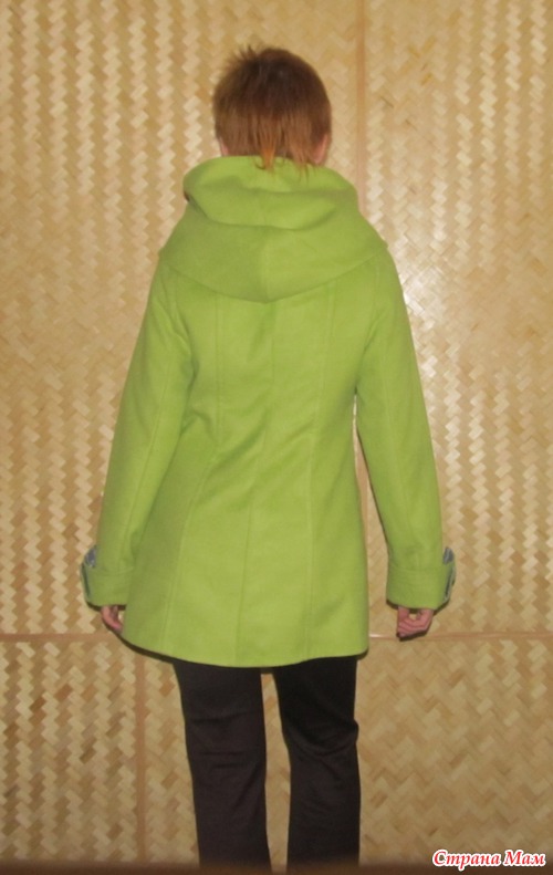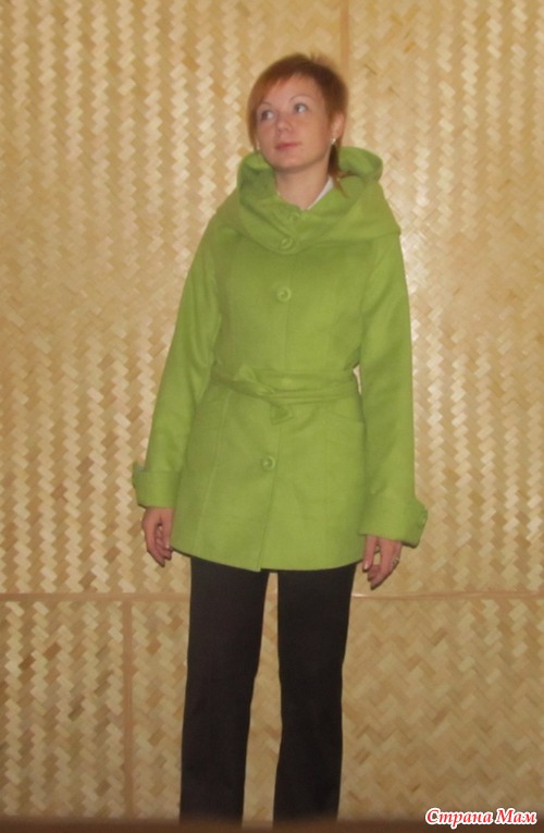 Пальто, кашемир, цвет зеленое яблоко. Обожаю необычные капюшоны, здесь он как раз такой - объёмный, широкий, застегивается на пуговицы. С поясом я немного поэкспериментировала - обмоталась в два раза, куплю наверно к этому пальто ремень-кушак.