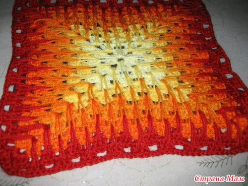 4. На фотографии "бабушкин квадрат" выполняется от светло-желтого к терракотовому и рисунок начинает смотреться уже после вывязывании 8-10 рядов, что надо учитывать.