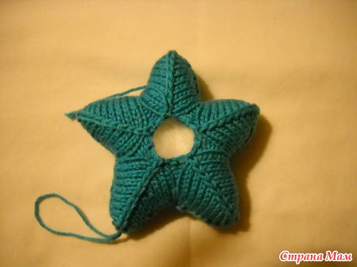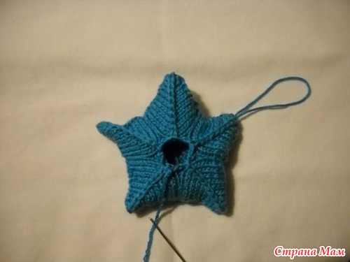 Затяните нить, закрепите. Я вывожу её в вершину луча, натягиваю и обрезаю. Кончик нити прячется в звезду.