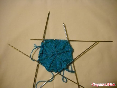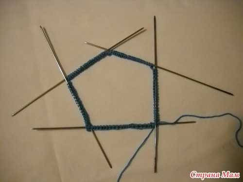 Присоедините нить, распределите петли на пять чулочных спиц. Следите за тем, чтобы изнаночные совпадали, иначе получите скособоченную звезду.