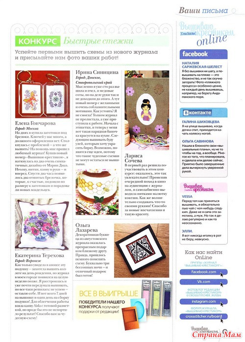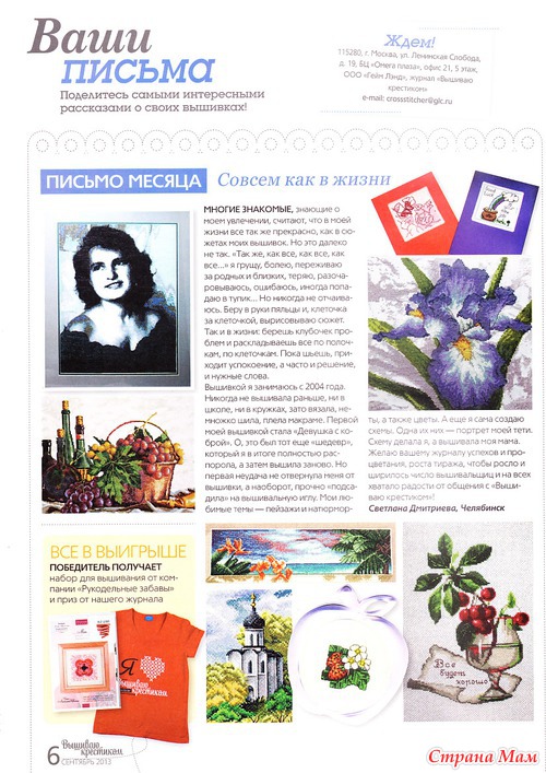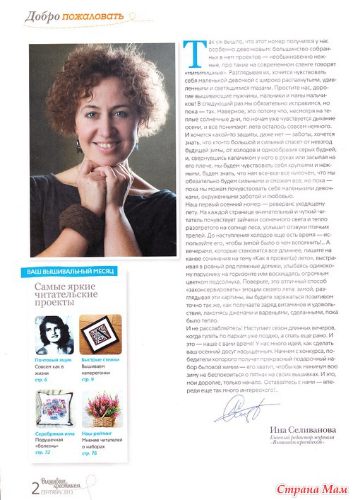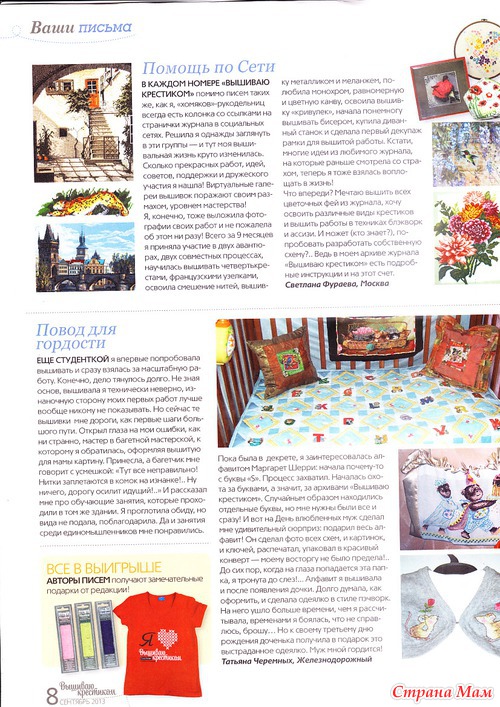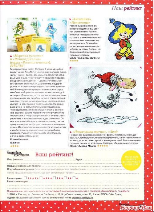 Покупаю каждый номер. Как-то подписку оформила. А он с опозданием на месяц приходил. Представьте мое состояние: на работу мимо "Союзпечати" иду, в окошке свежий номер, а мне такой месяц ждать приходилось Чуть дождалась окончания подписки. Пусть дороже, зато ... ну, почти вовремя (2-14 дней) покупаю. Последнее время мало вышиваю из него, зато читаю все, вплоть до рекламы .