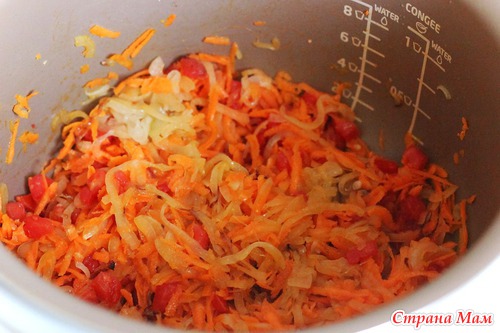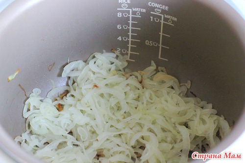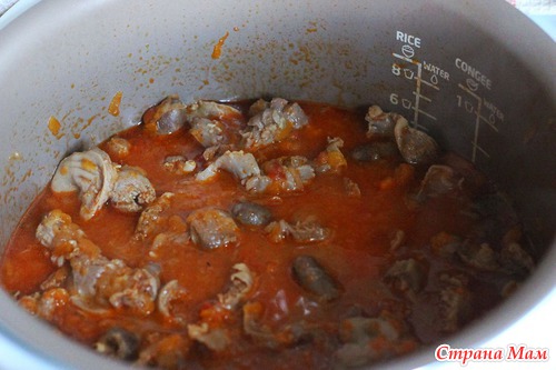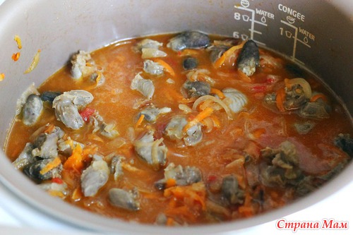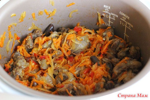 Я сперва протушила на сковороде желудки и сердечки чтоб убрать с них жидкость, пока тушатся желудки я в мультиварке в режиме жарка протушиваю лук мин 5-7