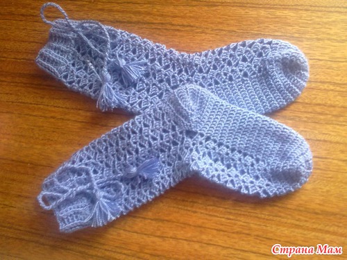 Но немного изменила:вязала из ириса, носочек связала меньше и подошва меньше и длинна. Когда вязала по схеме получились большие, а мне дали простые носочки, что бы по ним связать.