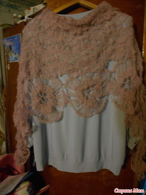 вот моё первое творение на вилке. Вообще то вяжу давно и спицами и крючком а вот вилку попробовала недавно.вязала ниточками Кид мохер 25гр. 200м. ушло 3 моточка.