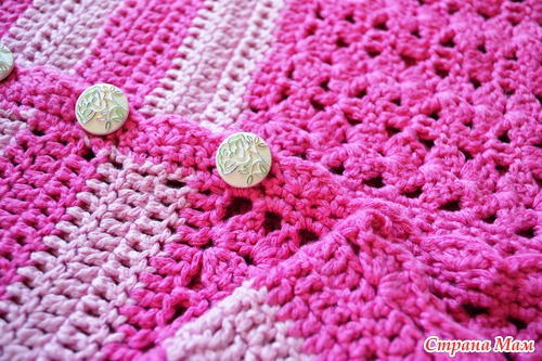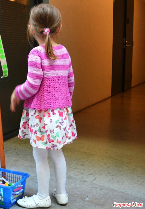 Вязала на 4 года, рост 104-110, под платья и юбки. Oт основной идеи онлайна остались только покрой и рисунок, а вот асимметрия и многоцветье не получились. Нитки Новита Бамбу 68% бамбук/32% хлопок, 135м в 50г, ушло 150 г тёмно-розовых и меньше 100 г светло-розовых. Крючок Кловер Амур нр 3.