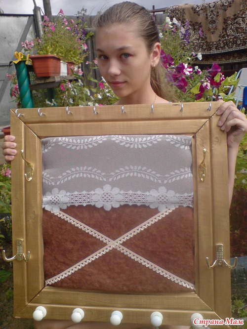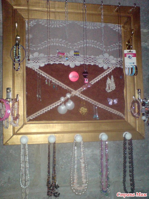 Много раз дочка пыталась объяснить, какая "штука" ей нужна, для того, чтобы сложить все украшения и их ( в отличии от шкатулки) было видно и удобно брать... Из остатков вагонки и кусочка фанерки папа смастерил картину... А я мебельным степлером (ткань+поролон) обтянула "вешалку" для украшений. Добавили крючочки, ручки от шкафчика, и вот ТО, что хотелось...