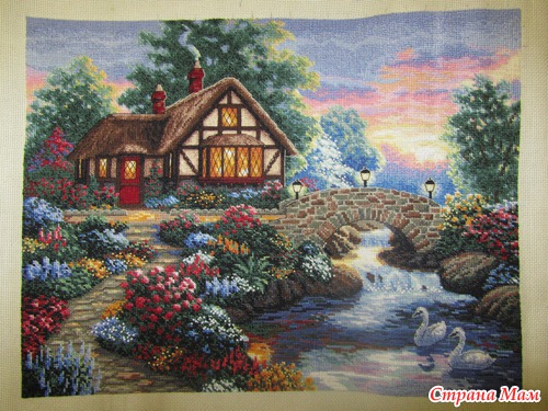 , докрутила последний фрузелок. Начинала я вышивать 24 февраля. Набор Дименшенс "Сумеречный мост" канва аида 18 размер 36 / 28см 41 цвет и 11 блендов. Здесь используются и крестики и полукрестики в 2-5 ниток и бек и фрузелки. А квартиру я уже купила, правда это не совсем то что надо (сестра риэлтор и решила подбить меня на куплю квартирки для перепродажи), но это один из шагов вперёд к своему дому!