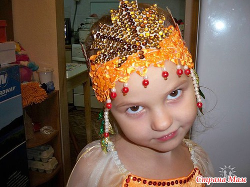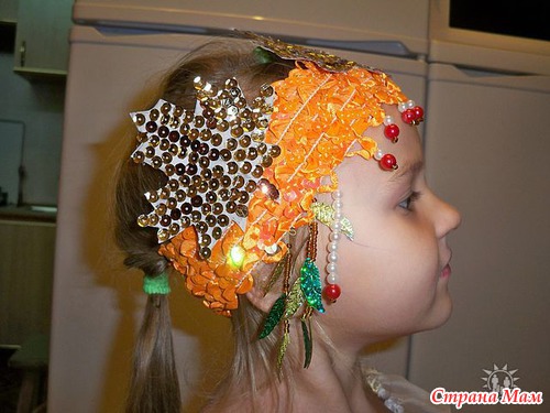 Материал, атласт., Капрон для рукавов и подюбника. Вышивка паетками и бисером. Головной убор из материала, внутри широкая резинка. Листочки из картона обшитые паетками.