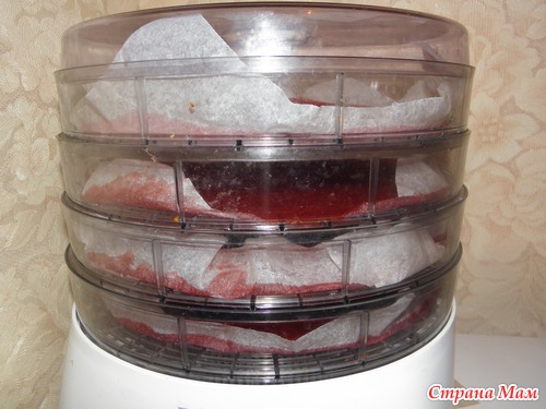 . Вечером поставила - утром уже лопали. Поскольку все пюре не вместилось в сушку - часть на противень вылила - оно так и до сих пор застывает (с воскресенья по среду - холодно наверное в квартире). А готовую пастилу свернула в рулетики (для гостей) и порезала "червячками" - детям так удобнее кушать - бегают и постоянно тягают со стола, чего и вашим деткам желаю