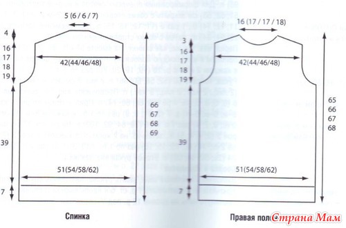 Перед: вязать так же, как спинку. На высоте 55 (56; 57; 58) см от резинки 1 х 1 (= 101; 107; 113; 116) п.) для формирования плечевых скосов закрыть с обеих сторон в каждом 2-м р.: