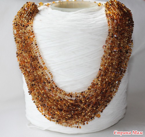 Прошлой осенью начала вязать свою первую воздушку. Нанизала смесь из бисера и чешских бусин на мононить, связала пару метров и оставила это дело. Закончила на прошлой неделе)