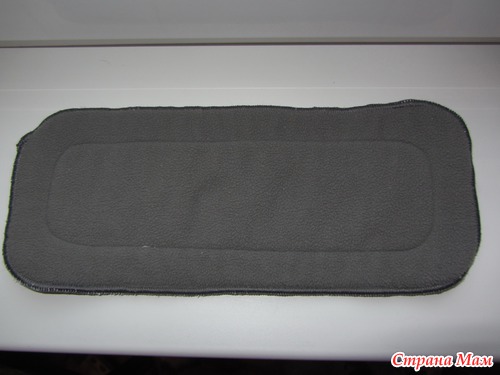 В комплекте с многоразовым подгузником идет такой вкладыш. Вкладыш пятислойный. Внешний слой - бамбуковое волокно, внутри - 3 слоя микрофибры. Вкладыш толстенький, впитывает хорошо и много. Размер 15*35 см