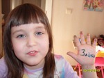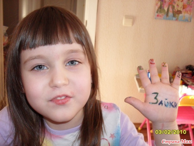 Большой палец распрямляется так, чтобы нарисованный на нем зайчик смотрел на остальных четырех.