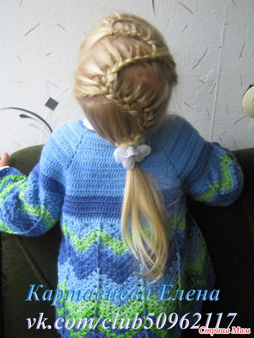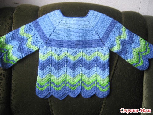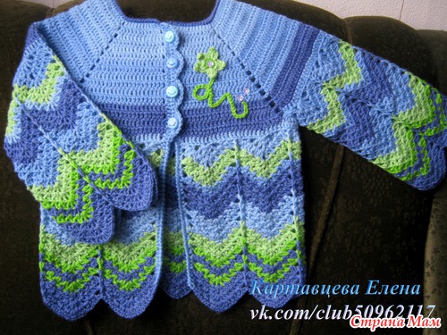 Девочки, доброго времени суток всем! Хочу показать вам очередную свою работу. Это кофточка. Связана полушерстяными нитками "детский каприз". Вязала крючком №2,5, ушло почти по мотку синих тонов (3штуки) и по чуть-чуть лимонного и зеленого. Вот тут я вязала таким же узором летнюю тунику https://www.stranamam.ru/post/4938268/, кому интересно, загляните.
